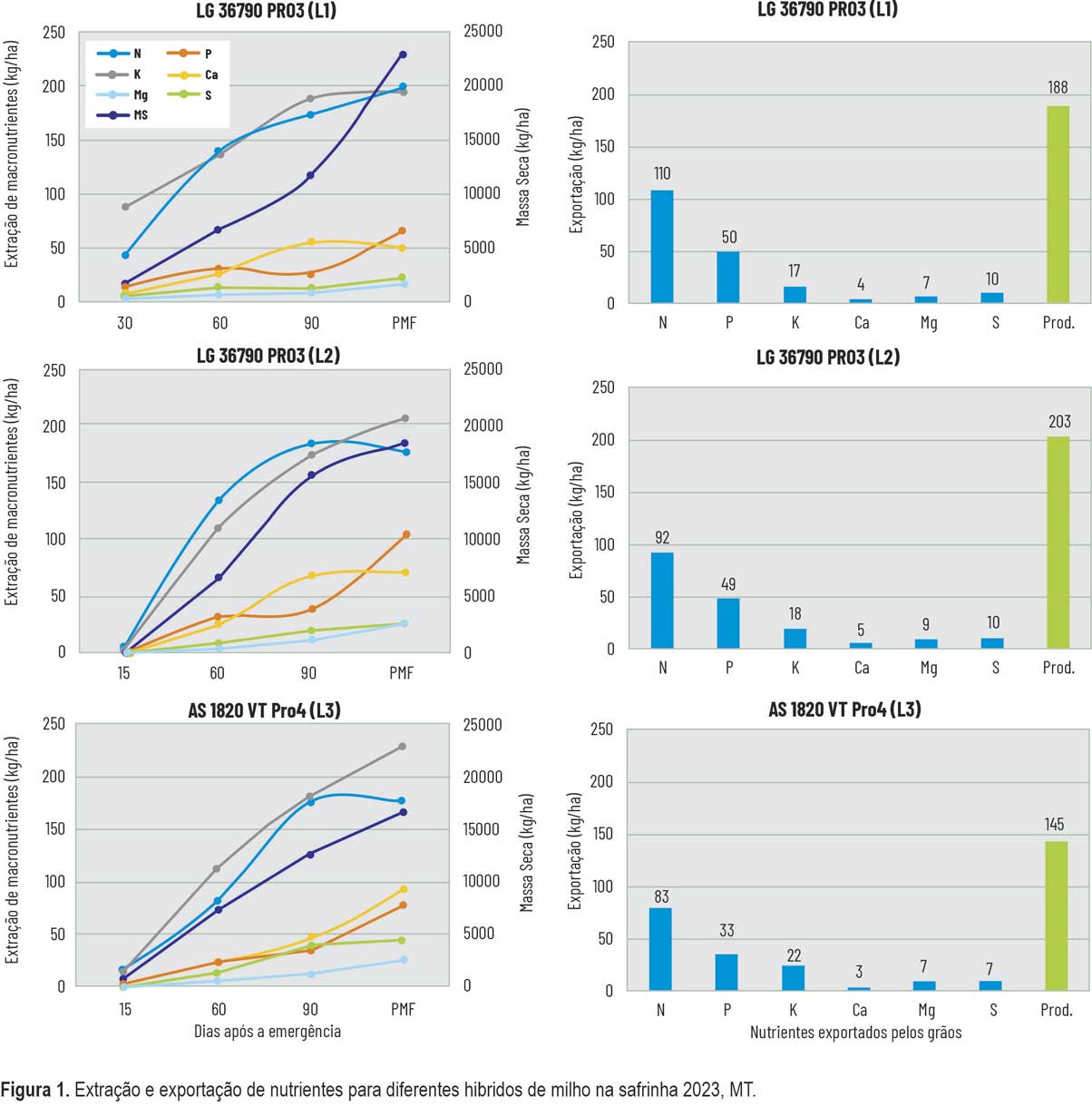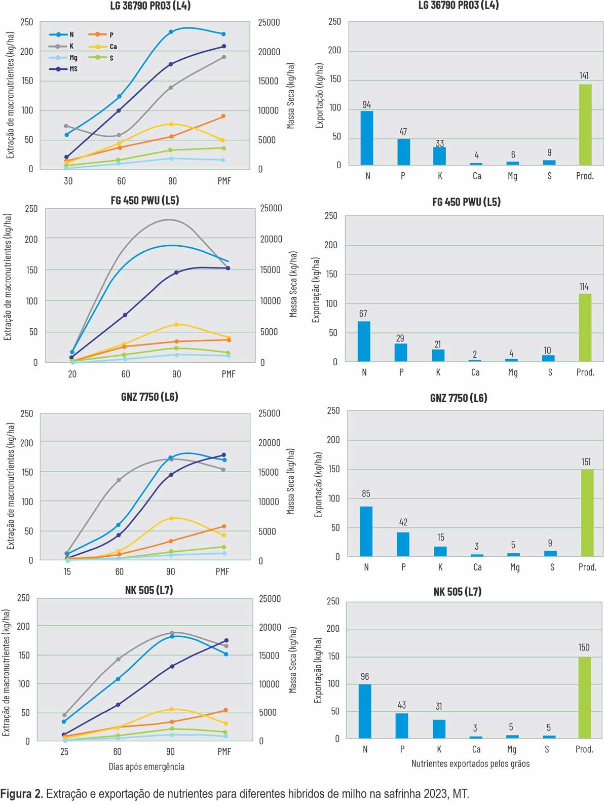 trapassando 150 kg/ha em praticamente todos os híbridos, mostrando a grande necessidade destes para a cultura assim como sua importância nos programas de adubação. Seguindo a ordem de demanda, fósforo (P), cálcio (Ca), enxofre (S) e magnésio (Mg) finalizam a lista (Figura 1 e 2).