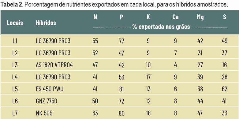 Realizou-se um trabalho em propriedades rurais na região do médio Norte de MT, com o intuito de mensurar a extração e exportação de nutrientes por alguns híbridos de milho (Tabela 1).