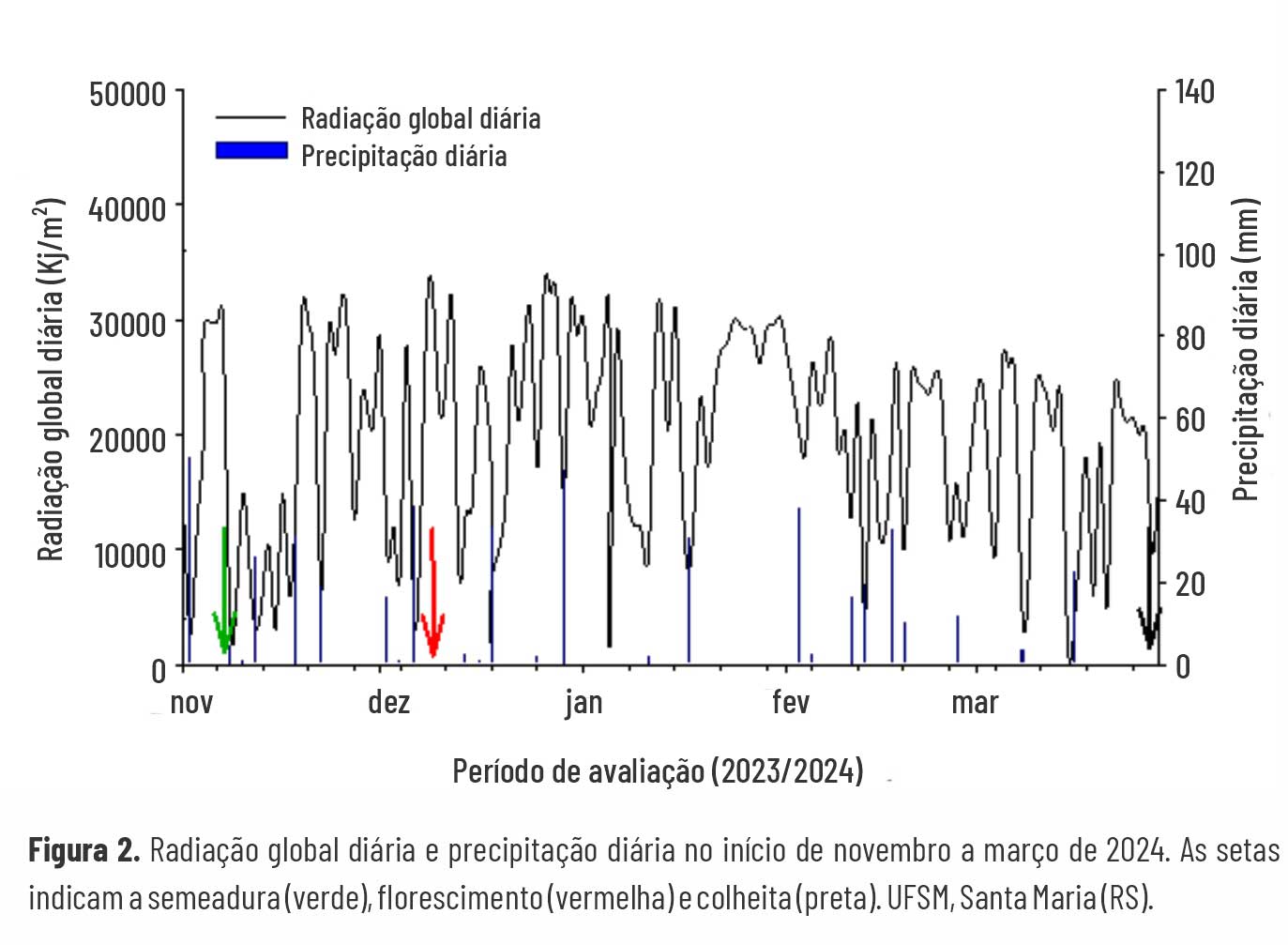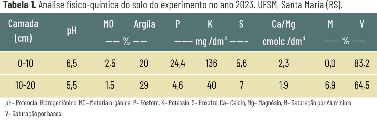 O experimento foi semeado em 17/11/2023, na área experimental pertencente ao Departamento de Fitotecnia da Universidade Federal de Santa Maria (UFSM), localizado nas coordenadas geográficas, -29º43’ de latitude sul, -53º44’ de longitude oeste e 103 metros de altitude, na safra 2023/24. O clima da região, conforme a classificação de Köppen, é do tipo Cfa, subtropical de clima temperado chuvoso (Alvares et al., 2013), precipitação média de 1688 mm ao ano. No mês mais quente, a temperatura média é de 24,8°C, e no mês mais frio é de 14,1°C (Heldwein et al., 2009). O solo do local é classificado como Argissolo Vermelho distrófico Arênico (Dos Santos et al., 2018), correspondente ao Ultisol (Soil Survey Taff, 2022). As características físico-químicas do solo estão apresentadas na Tabela 1.