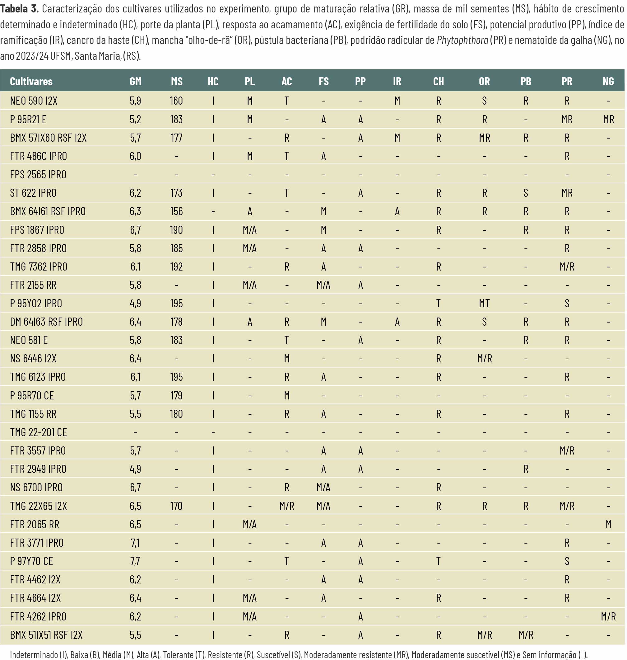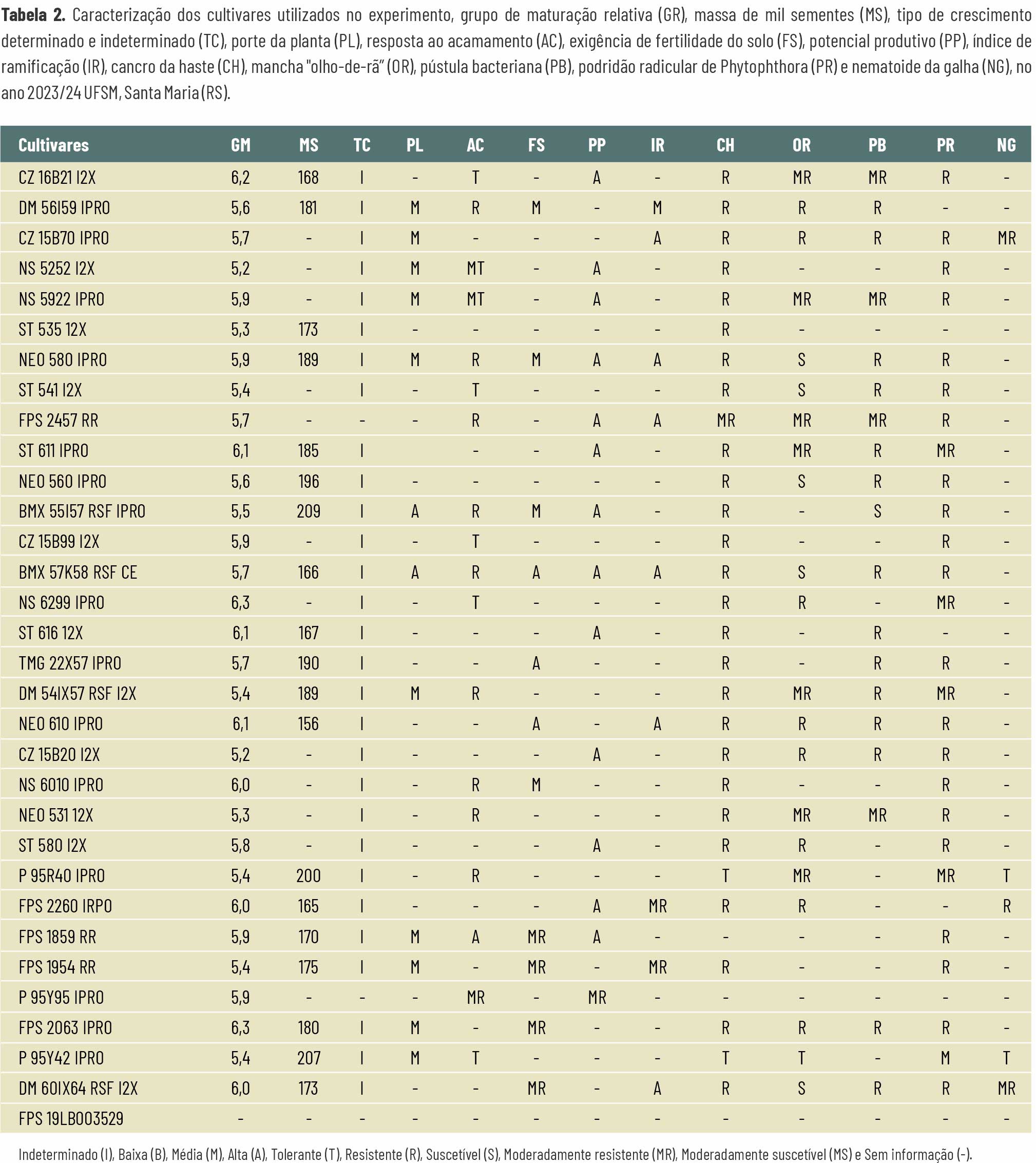 As Tabelas 2 e 3 apresentam as principais características gerais das 62 cultivares utilizadas no experimento, de acordo com as informações disponibilizadas nos sites das empresas detentoras dos materiais.
