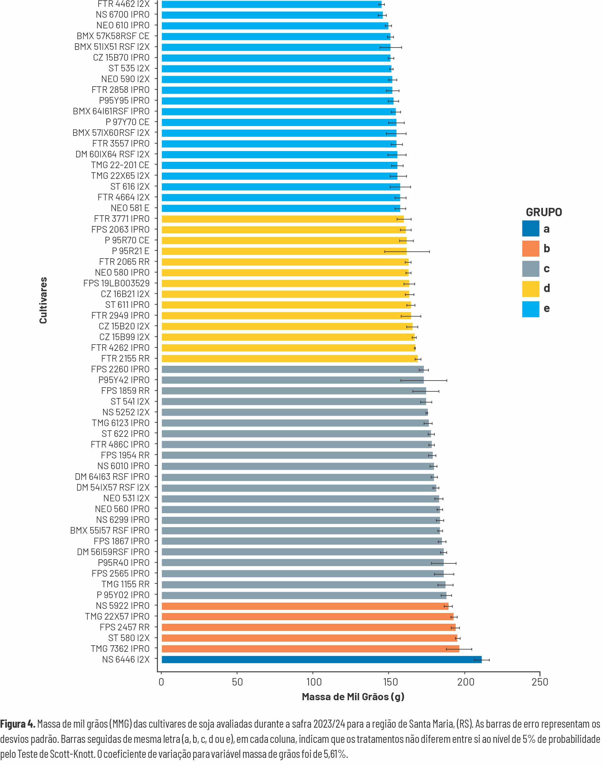 Para a variável PG (Figura 3), o “grupo A” apresenta valores entre 5274,7 e 5603,3 kg/ha, o “grupo B” valores entre 4543,1 e 5090,1 kg/ha, o “grupo C” valores entre 3656,1 e 4309,3 kg/ha e o “grupo D” apresenta valores entre 2854,3 e 3557,7 kg/ha. Para a variável MMG (Figura 4), a cultivar NS 6446 I2X apresenta a média mais alta de 210,63 g, formando unicamente o “grupo A”, que difere estatisticamente em relação ao “grupo B”, representado com cinco cultivares que apresentam valores entre 188,43 e 195,68 g. O “grupo C”, com 22 cultivares que apresentam valores entre 172,38 e 187,21 g. Já o “grupo D” valores entre 160,63 e 168,64 g com 11 cultivares e o “grupo E” valores entre 144,65 e 159,42 g representado por 17 cultivares.