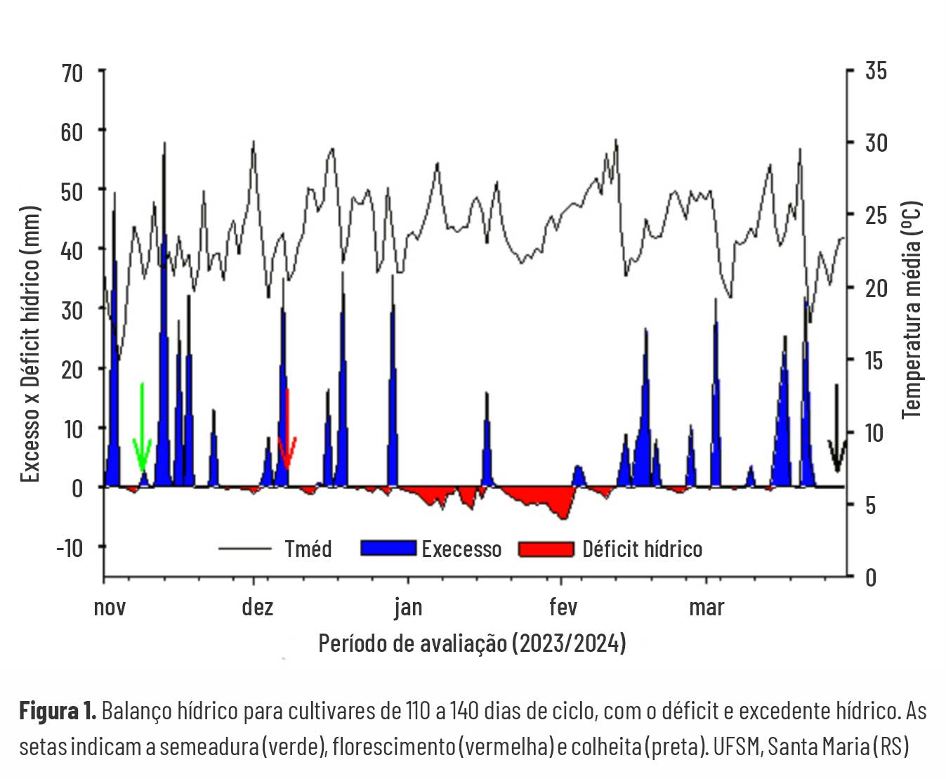Estudos anteriores do Grupo Coxilha na região central do Estado do Rio Grande do Sul mostram que há variabilidade em MMG e PG na cultura (Fulaneti et al., 2023). Salienta-se que foi um ano com alto volume de chuvas (Figura 1) em que vários dias apresentaram excesso hídrico, impactando em atraso na semeadura, ressemeadura de algumas cultivares e atraso no período de colheita, contudo, a chuva foi essencial para momentos mais críticos da cultura.