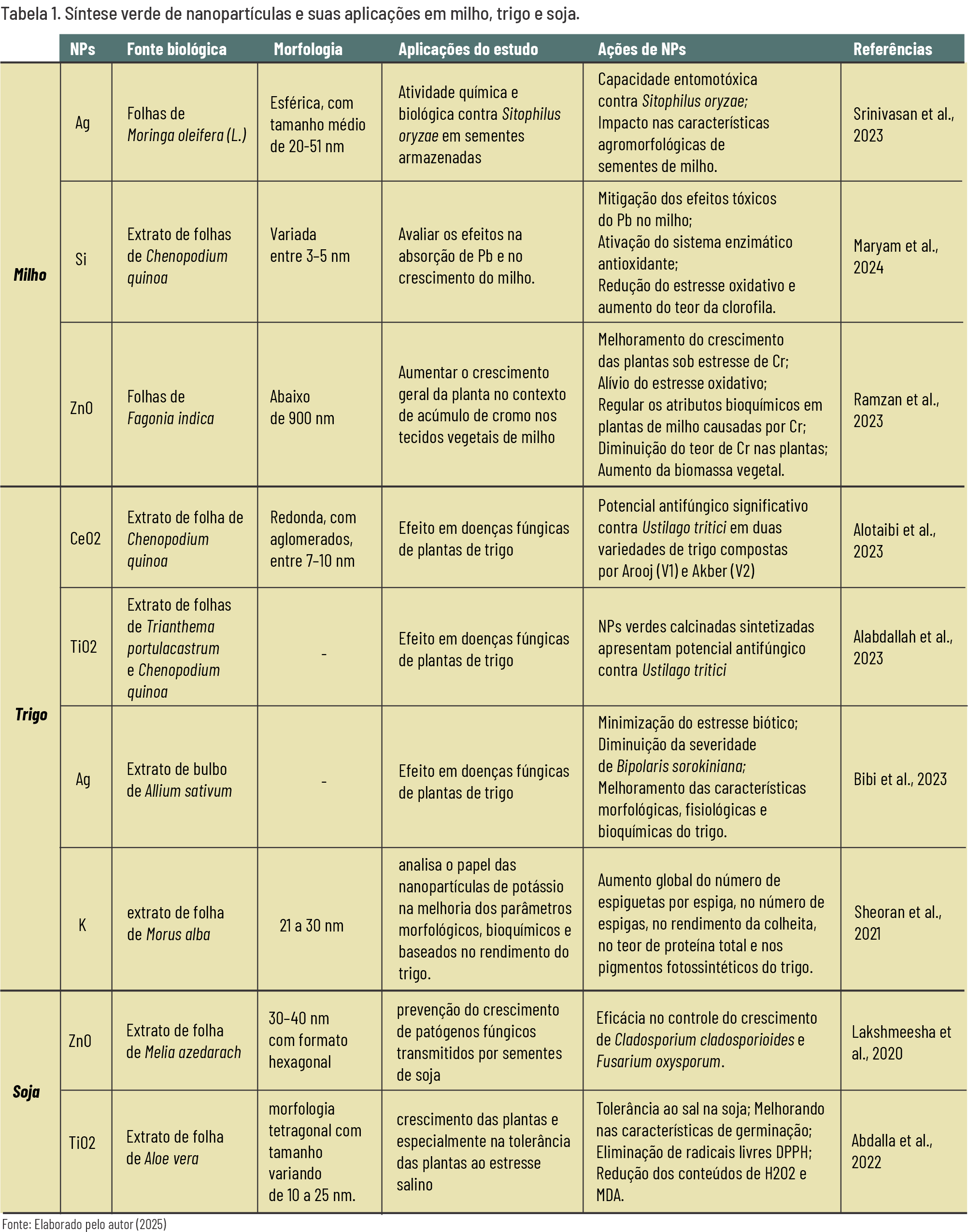 A grande produção dessas culturas envolve a dinâmica do ecossistema e as inovações biotecnoecológicas. Este artigo reúne as NPs mais utilizadas nessas culturas com o objetivo de demonstrar os efeitos benéficos de novas perspectivas para a produção agrícola no setor da nanotecnologia.