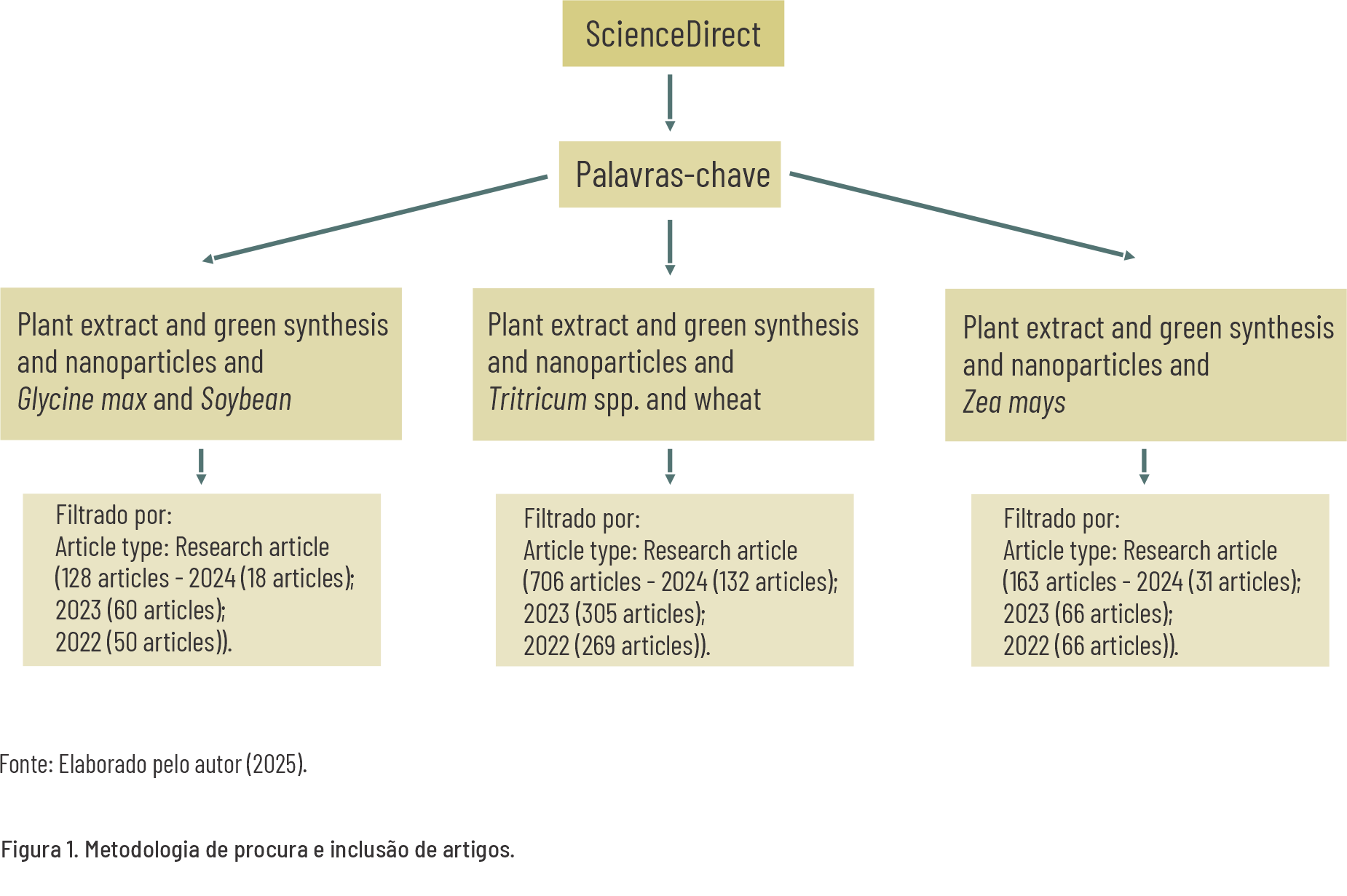 Esse estudo é constituído por uma revisão bibliográfica que segue alguns critérios. Os artigos foram obtidos na base de dados ScienceDirect com a combinação de palavras-chave detalhadas na Figura 1. No total, seguindo nosso entendimento atual sobre bioprocesso, nanopartículas, síntese verde e produção agrícola, foram selecionados 18 artigos, considerando apenas os estudos de pesquisa da primeira página da base de dados que continham as palavras chaves destacadas.