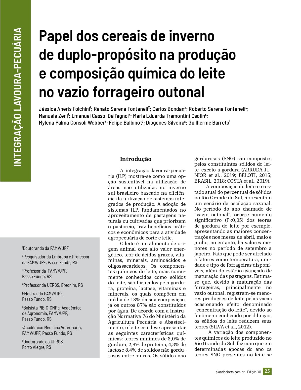 Papel dos cereais de inverno de duplo-propósito na produção e composição química do leite no vazio forrageiro outonal