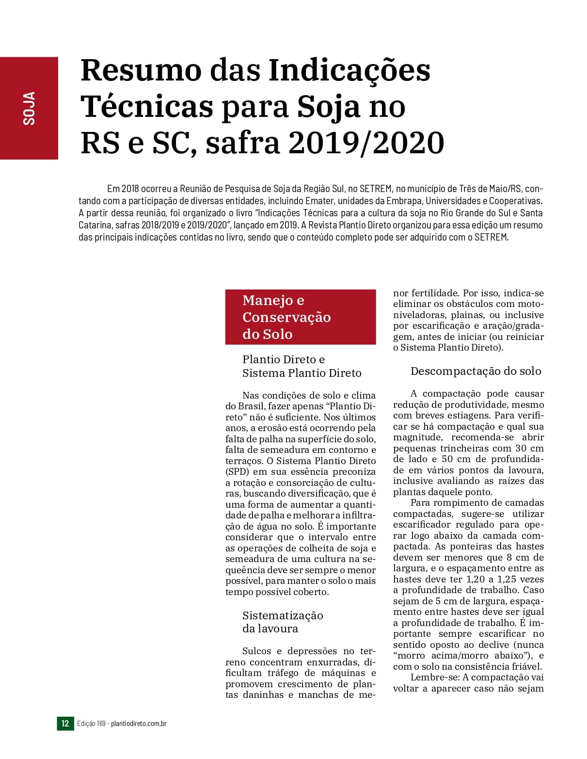 Resumo das Indicações Técnicas para Soja no RS e SC, safra 2019/2020
