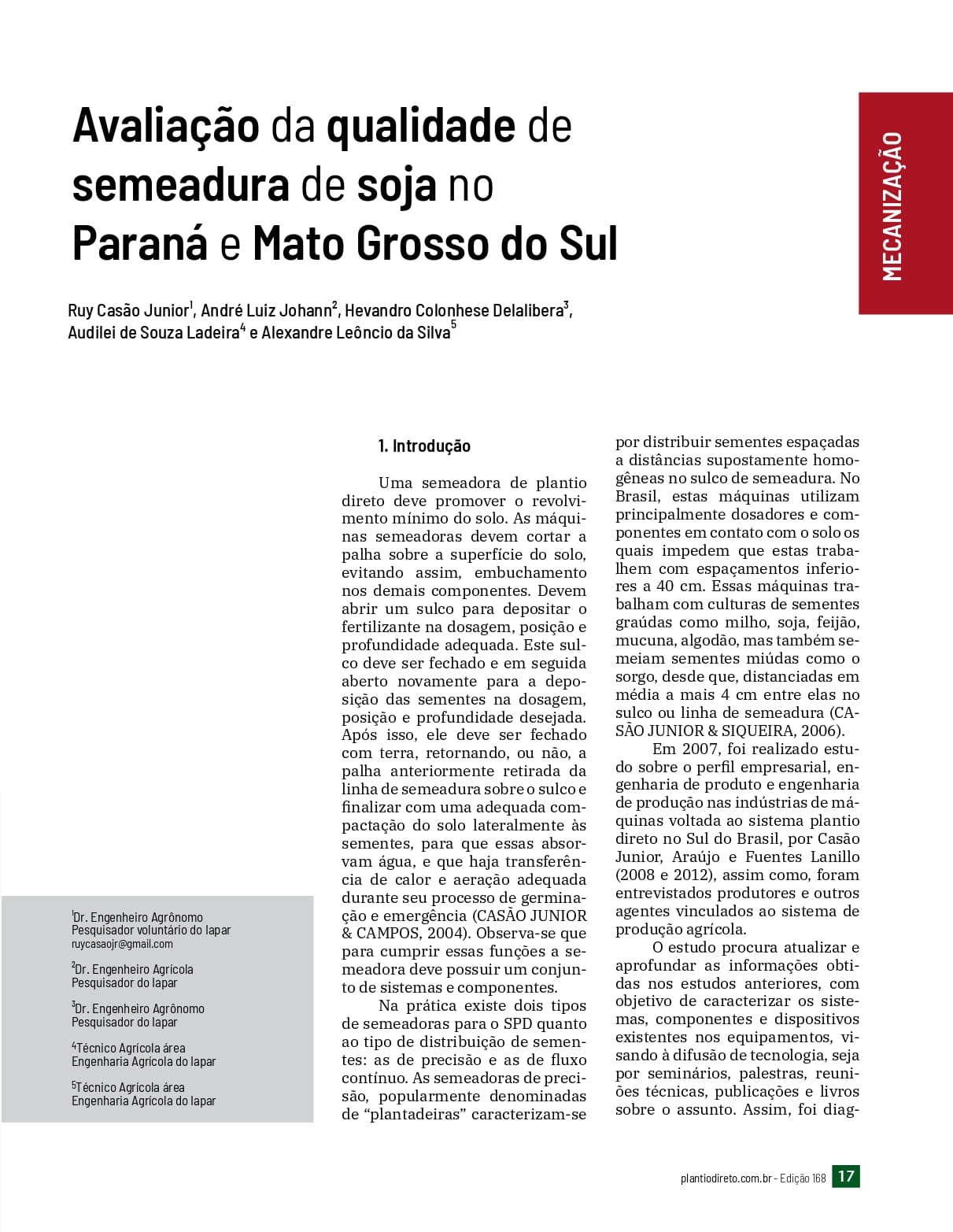 Avaliação da qualidade de semeadura de soja no Paraná e Mato Grosso do Sul