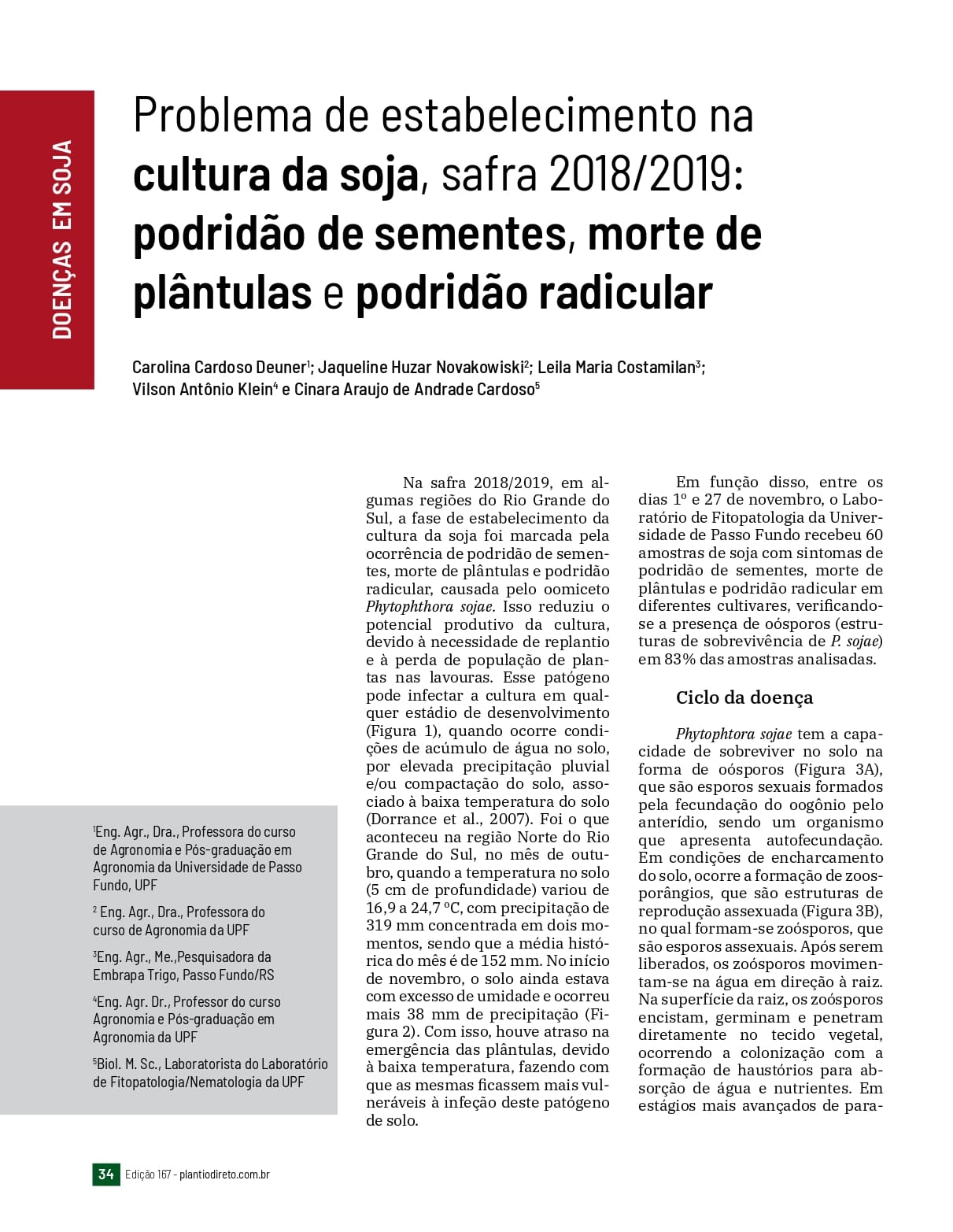 Problema de estabelecimento na cultura da soja, safra 2018/2019: podridão de sementes, morte de plântulas e podridão radicular