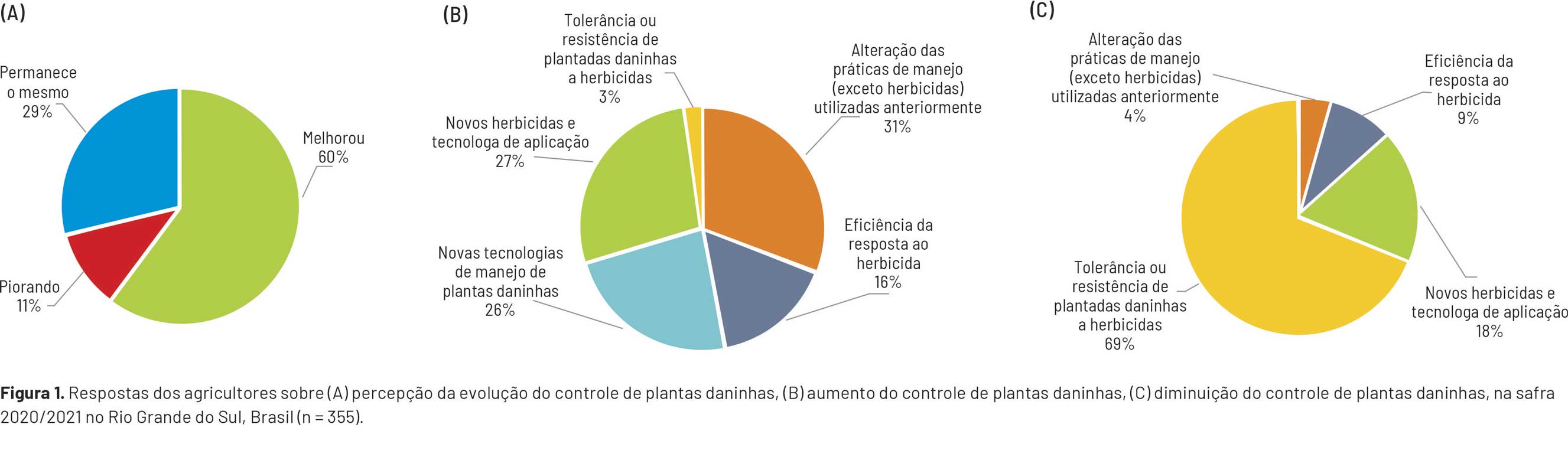 Em relação a percepção dos produtores sobre a evolução do controle de plantas daninhas, 60% dos entrevistados declararam que melhorou nos últimos anos, 29% declararam que permanece o mesmo, enquanto para 11% dos entrevistados houve uma tendência de redução da eficácia no controle das invasoras nas últimas safras (Figura 1A). Quando questionados sobre o que motivou suas escolhas, 31% dos produtores relataram que o controle estava melhorando devido à alteração das práticas de manejo não relacionadas ao uso de herbicidas (Figura 1B).