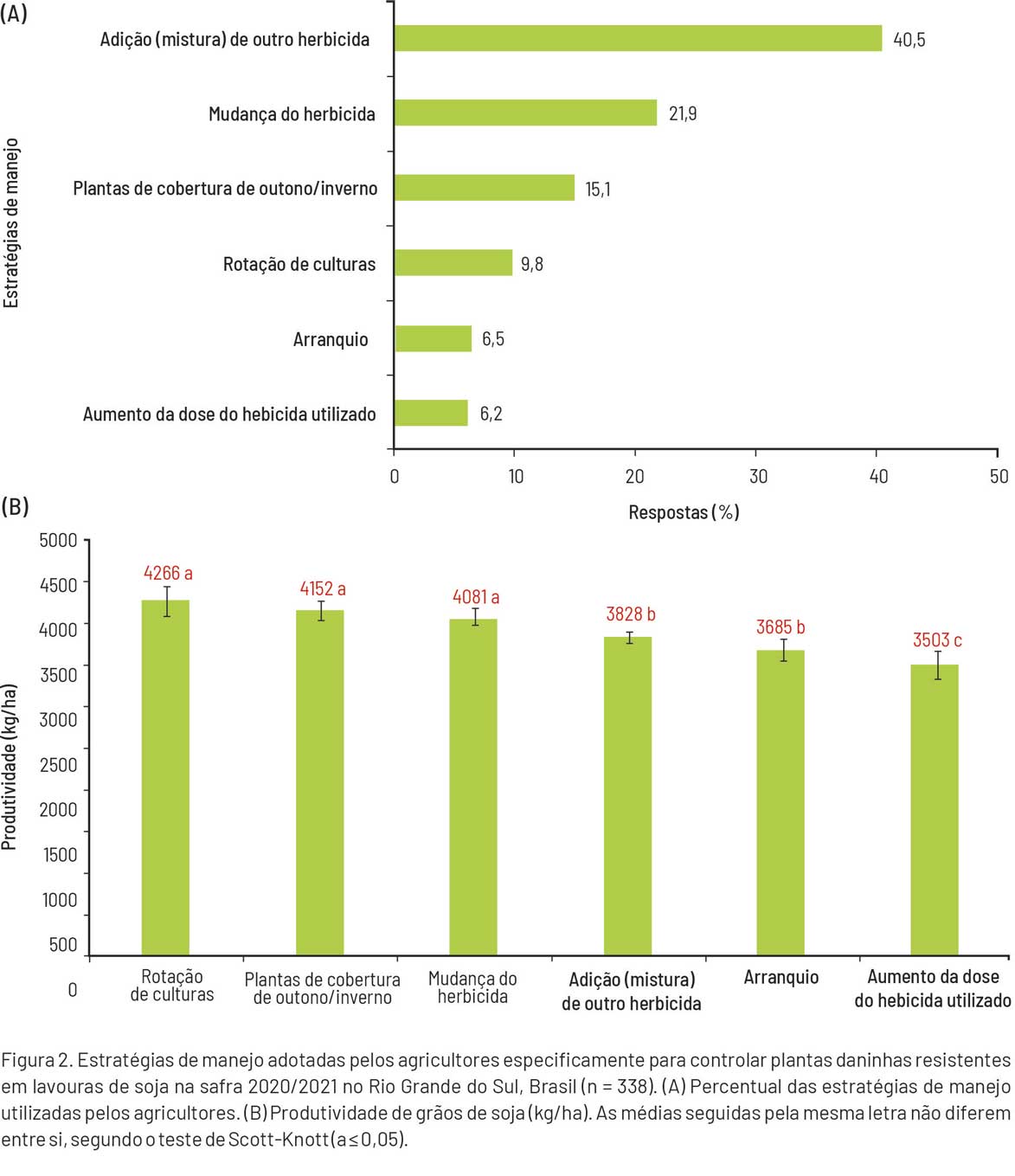 A mistura de herbicidas em tanque é a principal estratégia de manejo relatada, enquanto a rotação de culturas, plantas de cobertura e mudança do herbicida se destacaram com os melhores resultados de produtividade. Por fim, este estudo ressalta a importância de identificar os resultados das práticas de manejo dos produtores para oferecer evidências que auxiliem nas tomadas de decisões a fim de reduzir perdas causadas por plantas daninhas resistentes.