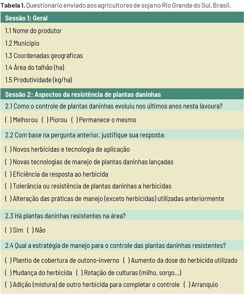 O presente estudo teve como objetivo entender como o controle de plantas daninhas está evoluindo no Rio Grande do Sul, e relacionar as estratégias de manejo de plantas daninhas resistentes adotadas pelos agricultores com a produtividade de grãos de soja. Nesse sentido, é necessário investigar os fatores envolvidos nas tomadas de decisão dos produtores quanto ao controle de plantas daninhas, bem como os resultados obtidos com suas práticas de manejo (JUSSAUME JR. et al, 2022).