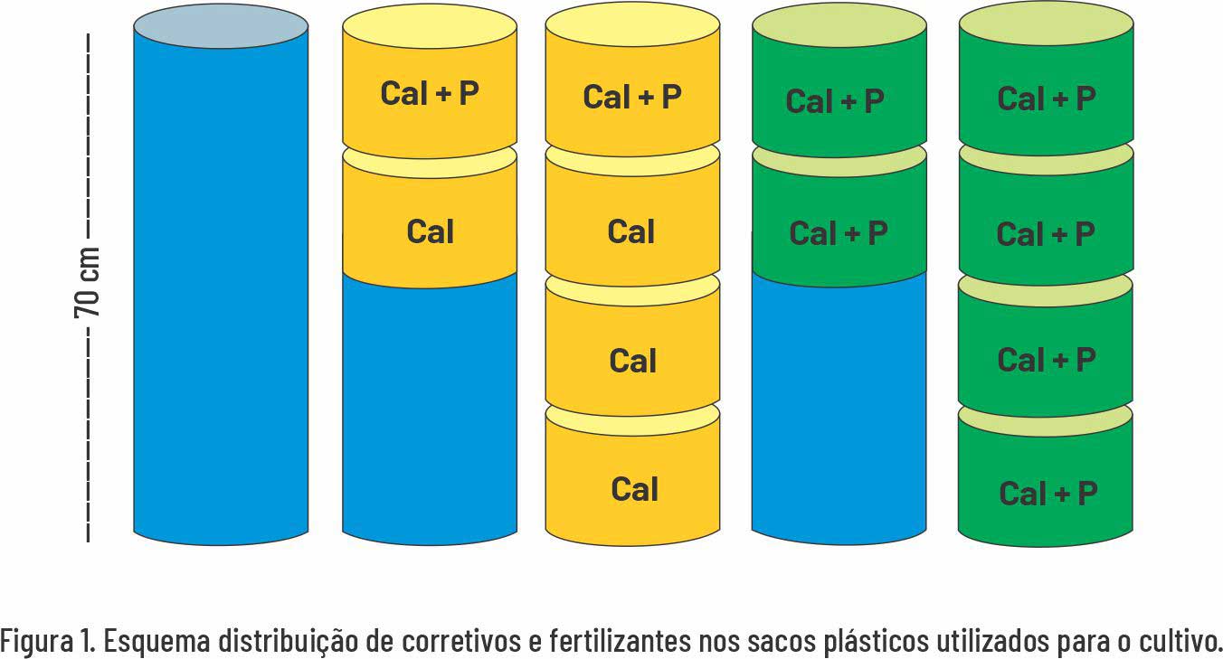 Foi utilizado o delineamento inteiramente casualizado (DIC), com 5 tratamentos e 6 repetições, variando a correção do perfil do solo com calcário e fósforo, sendo: (T1) omissão total de ambos, (T2) fósforo incorporado a 15 cm e calagem até 35 cm, (T3) fósforo incorporado a 15 cm e calagem até 70 cm, (T4) fósforo e calcário incorporados a 35 cm e (T5) fósforo e calcário incorporados a 70 cm, conforme ilustra a figura 1. A dose de calcário foi equivalente a 8 ton/ha (calcário dolomítico, PRNT 89) e a fosfatagem, aplicou-se 300 mg/kg de P, via 05-32-04.