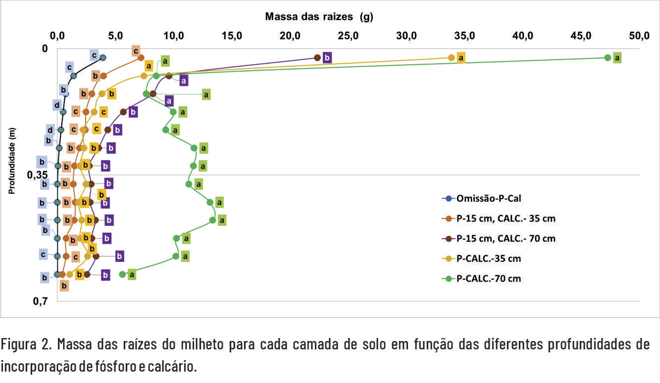 A distribuição em profundidade da massa das raízes foi influenciada pela disponibilidade de P ao longo do perfil, assim como a massa da parte aérea e a altura das plantas. A inibição do crescimento das plantas sob deficiência de P é devida ao alongamento celular reduzido afetando a atividade meristemática e é irreversível quando a deficiência de P é mantida por muitos dias, o que resultará em menor rendimento (Reymond et al., 2006).