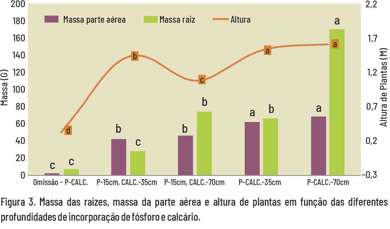 A incorporação de calcário e fósforo no solo, no caso do estudo até 70 cm de profundidade, constrói perfil de solo quimicamente e propicia o desenvolvimento agressivo das raízes em profundidade, o que garante condições para que a planta tenha desenvolvimento máximo.
